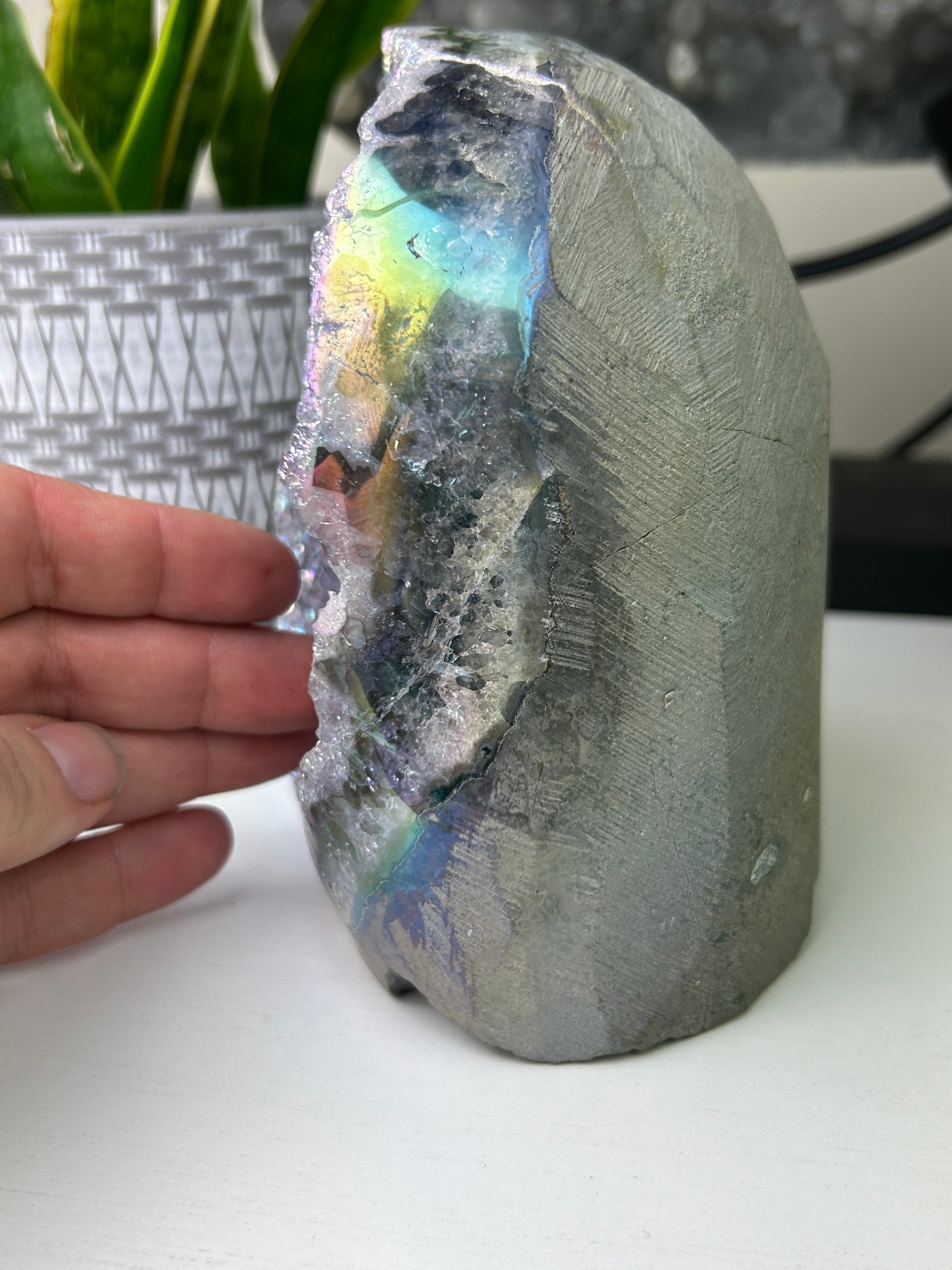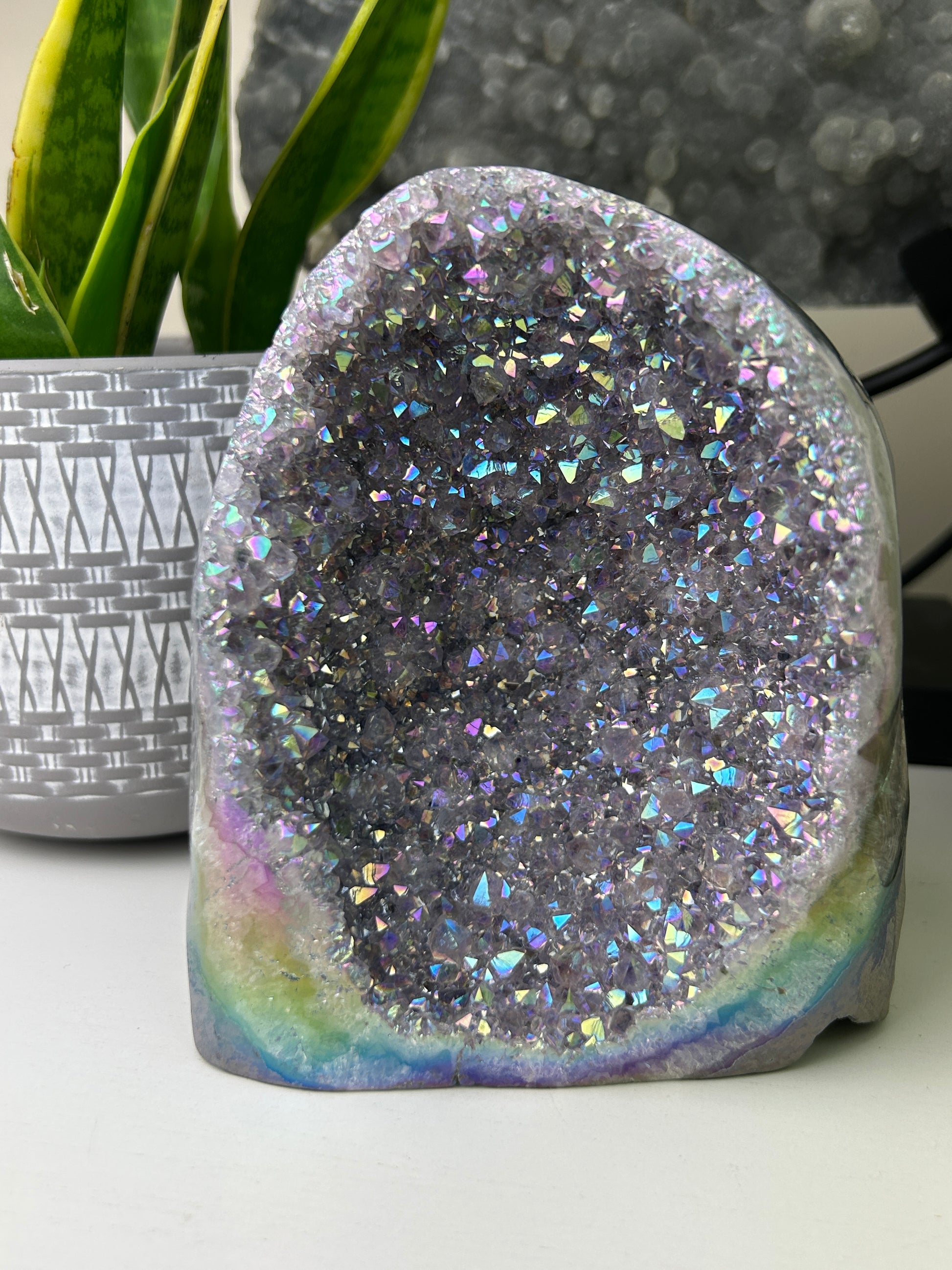This stunning large Brazilian Aura Amethyst radiates soft, high-vibrational energy with its delicate pink-lavender hue and shimmering, rainbow aura coating. The natural amethyst cluster has been treated with a fine layer of precious metals, creating an ethereal iridescence that enhances its already calming and spiritual presence.