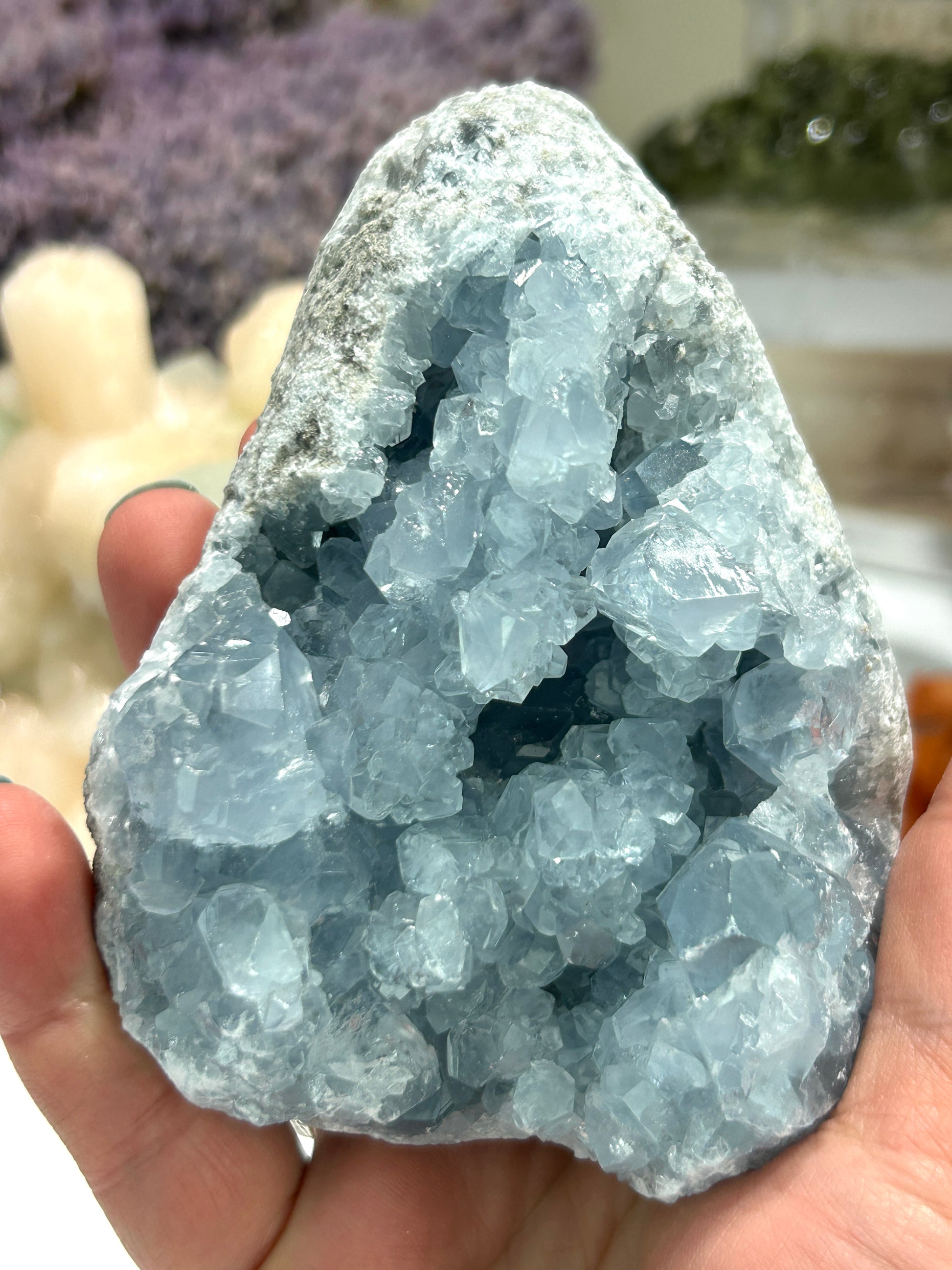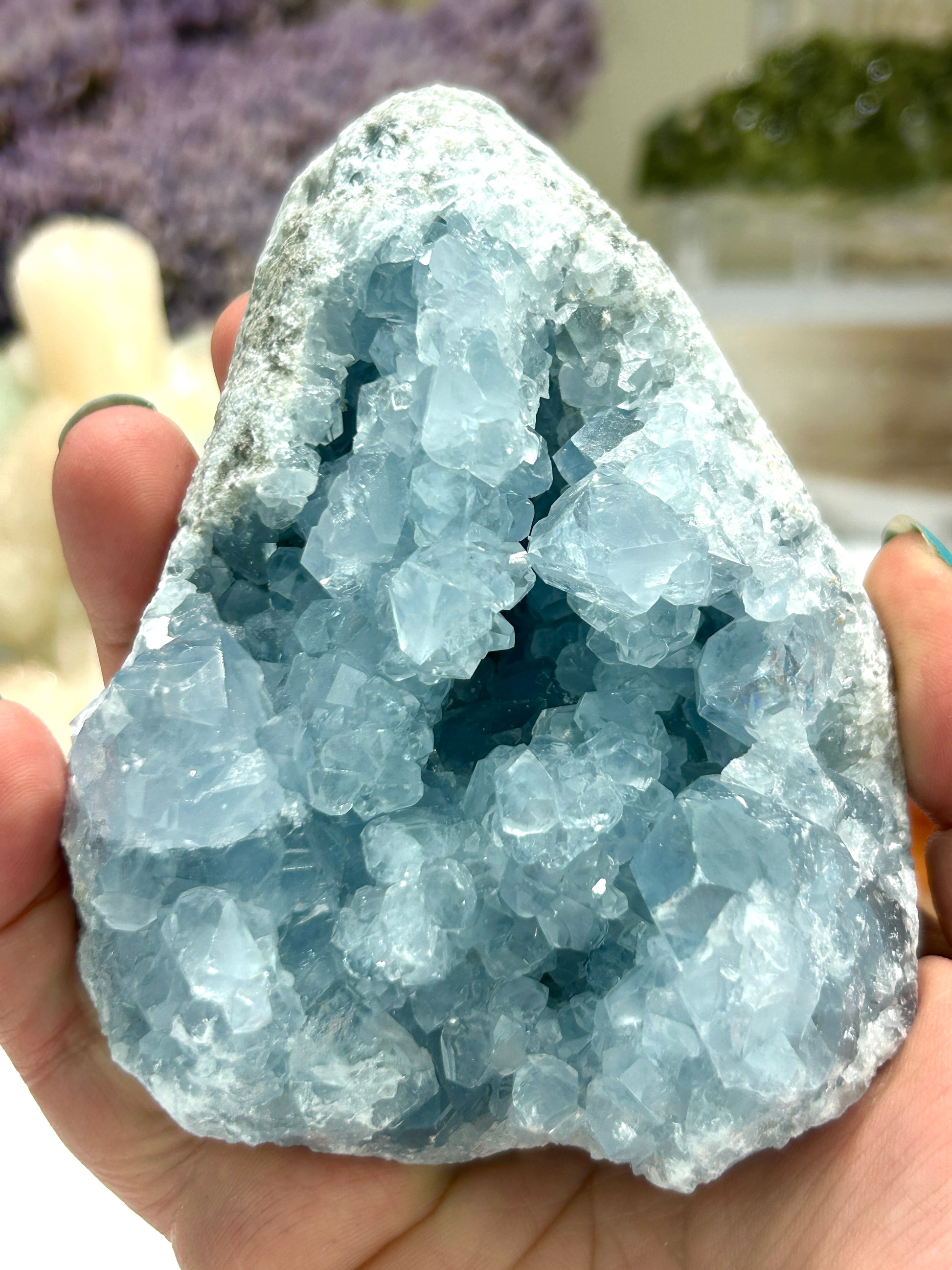 Invite calm, clarity, and celestial energy into your space with our Medium Celestite Geode. With its sky-blue crystal clusters nestled in a natural geode form, this piece exudes serene beauty and gentle, uplifting vibrations.