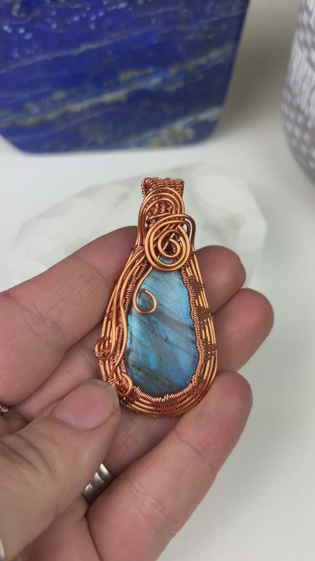 This mesmerizing Labradorite pendant is a true statement of magic and craftsmanship. Featuring a luminous blue flash that dances in the light, the stone is hand-wrapped in warm, intricate jewelry-grade copper wire, creating a piece that feels both earthy and enchanted.