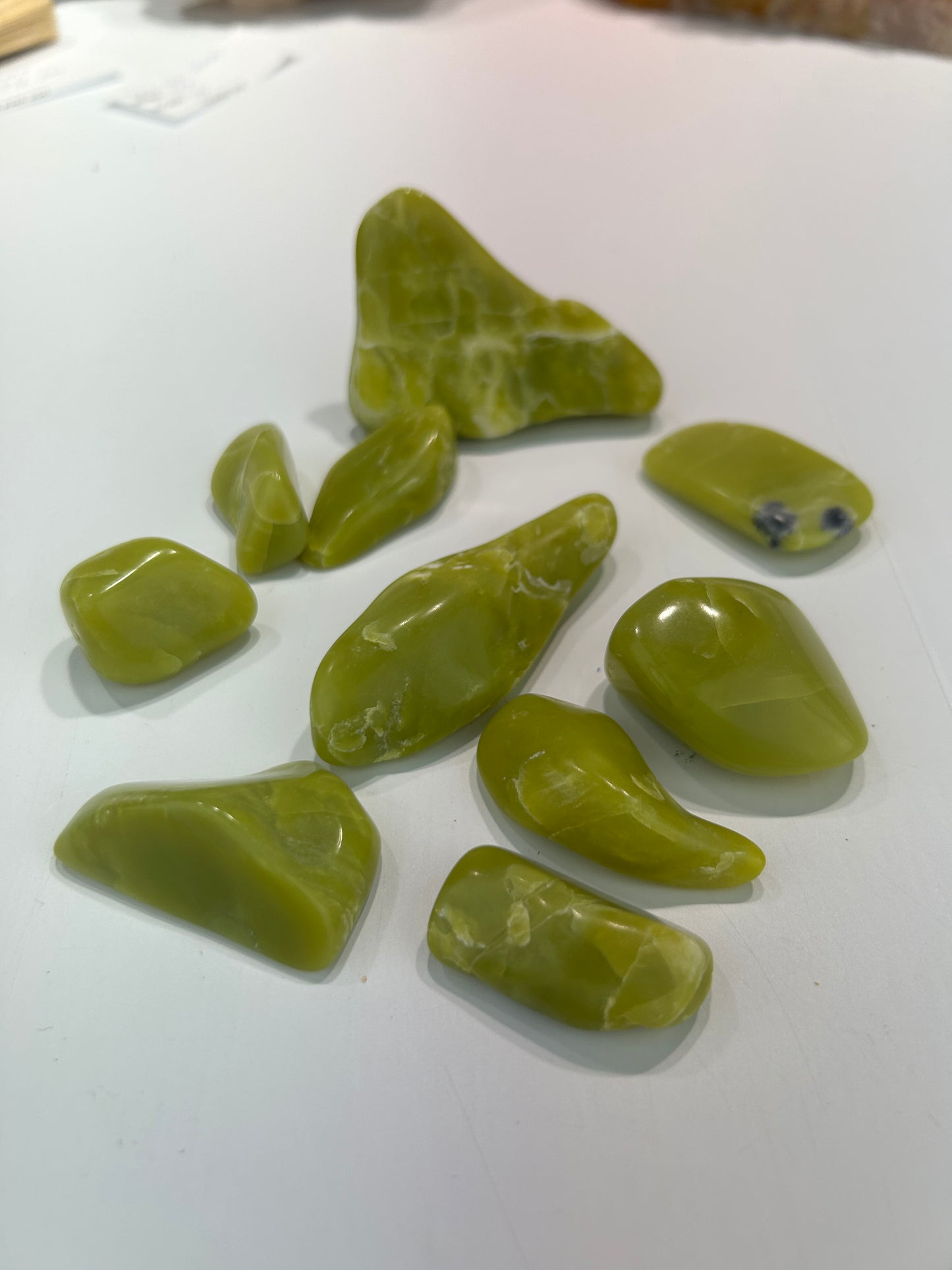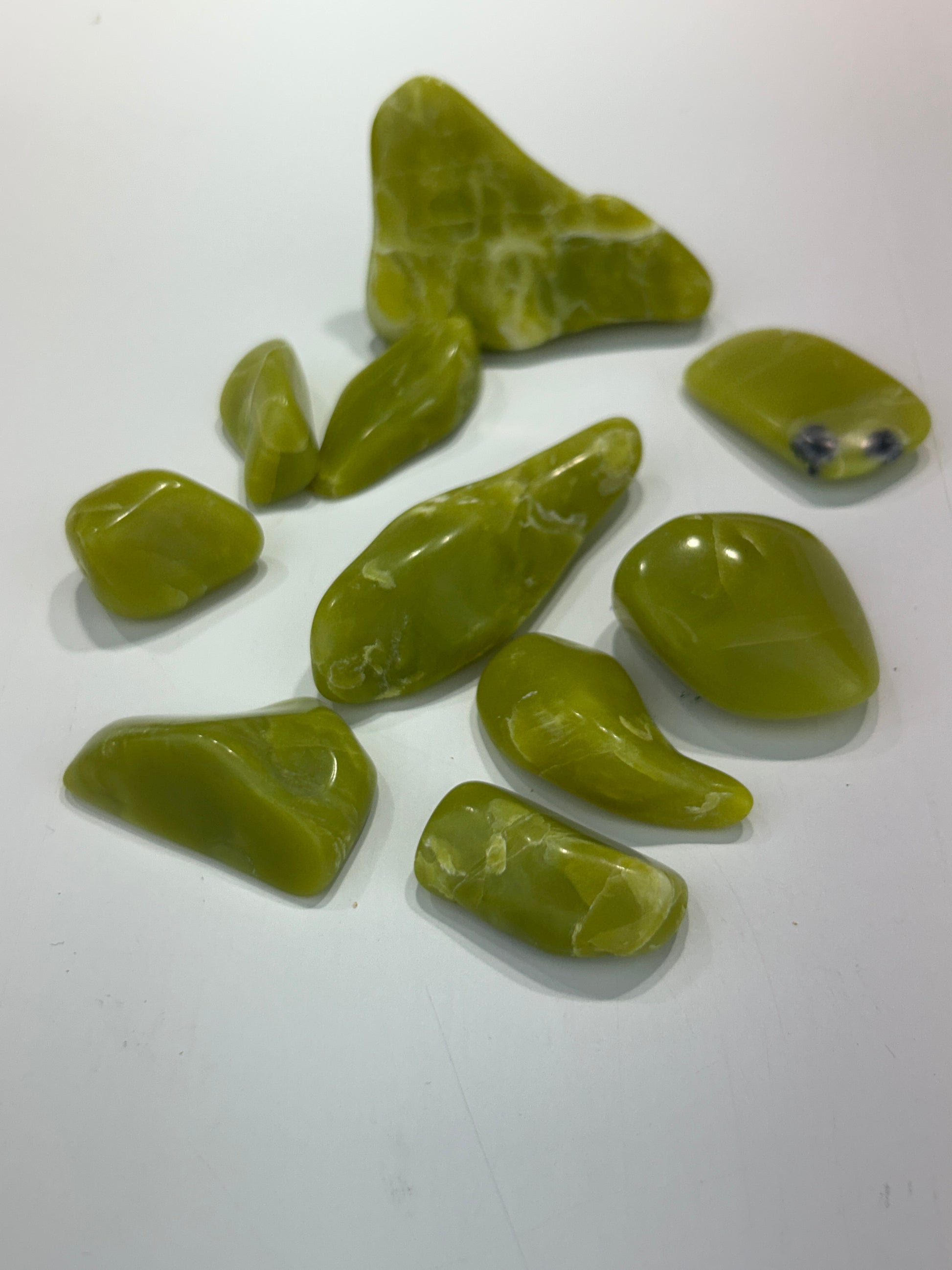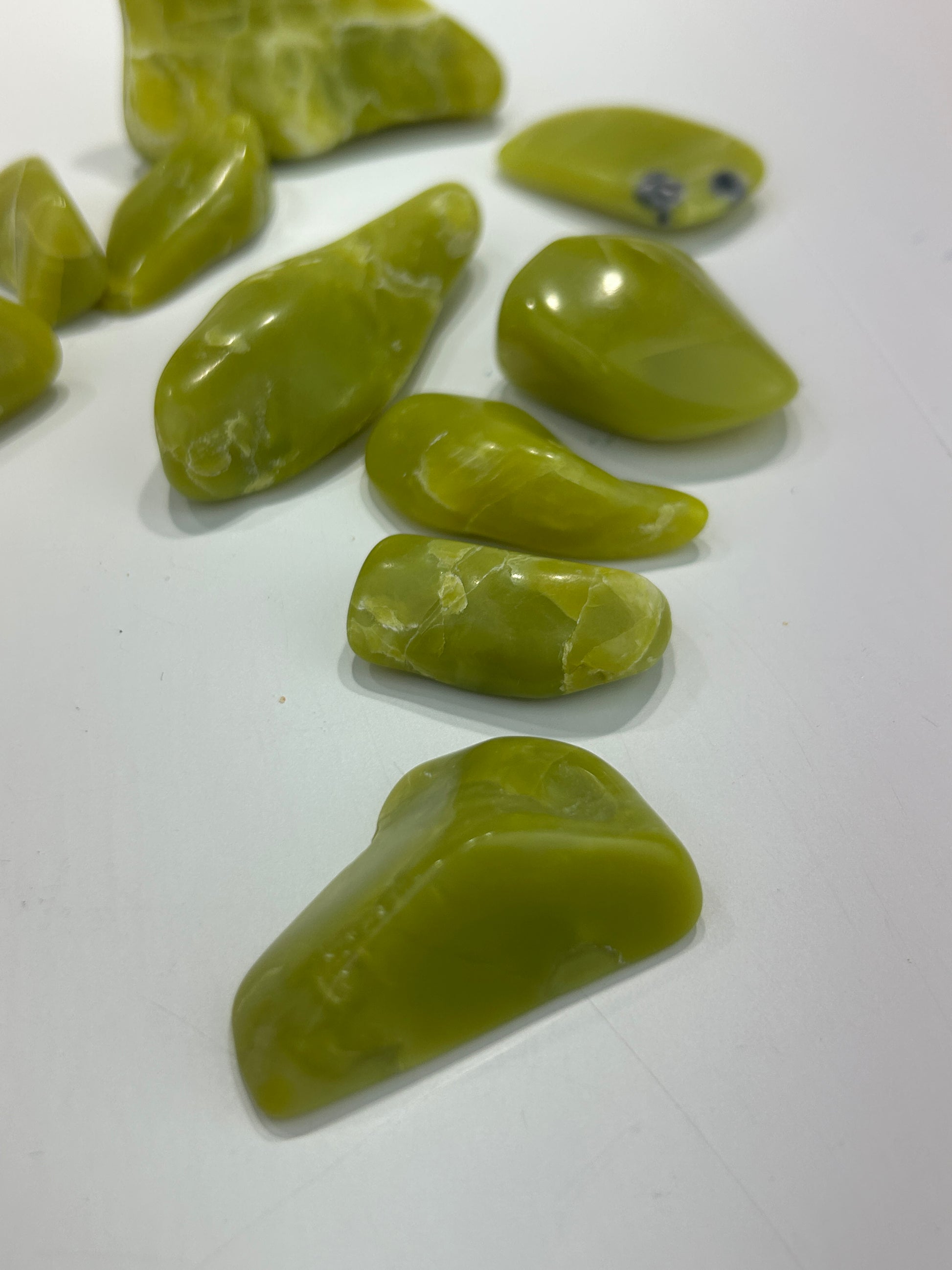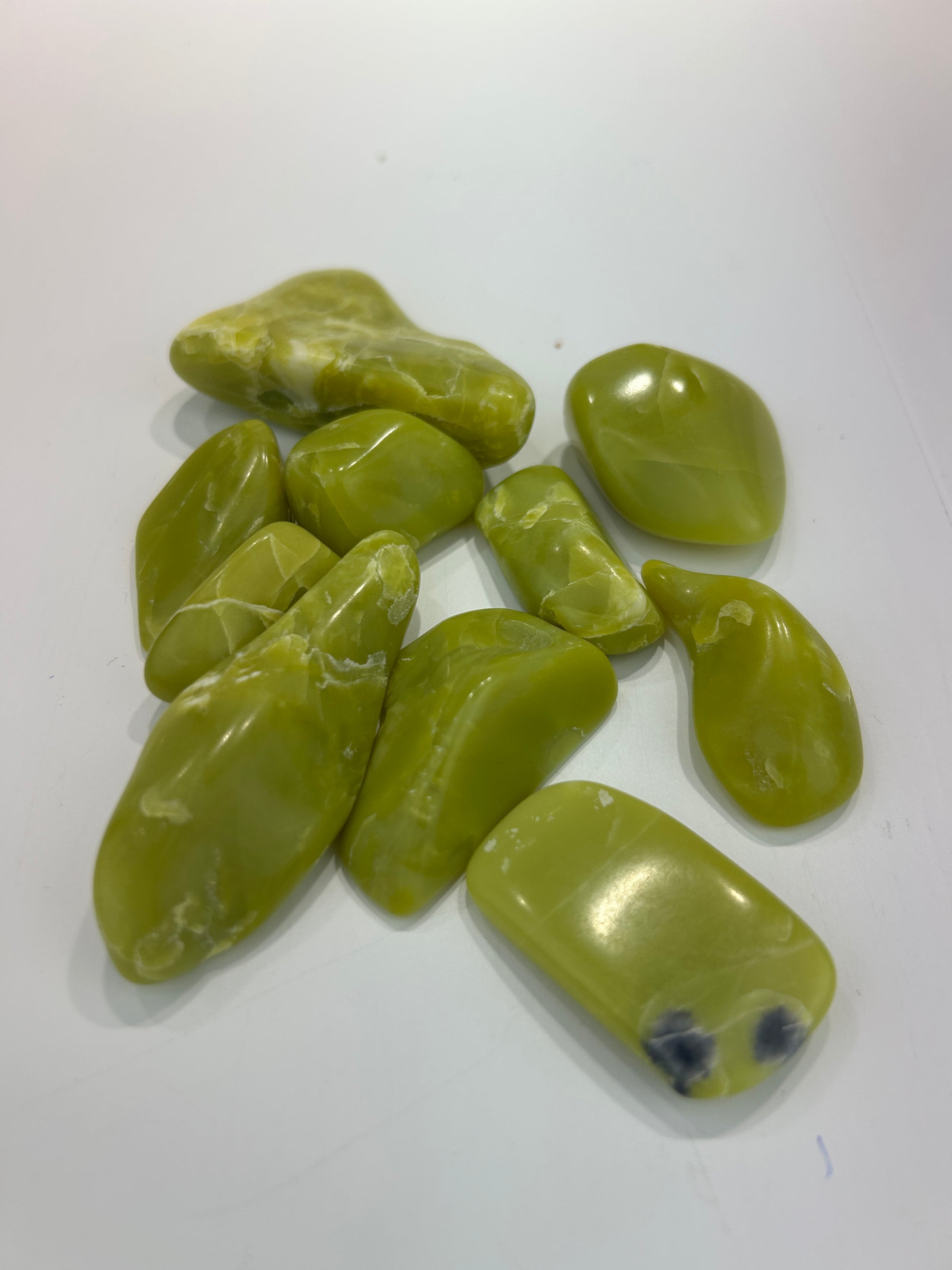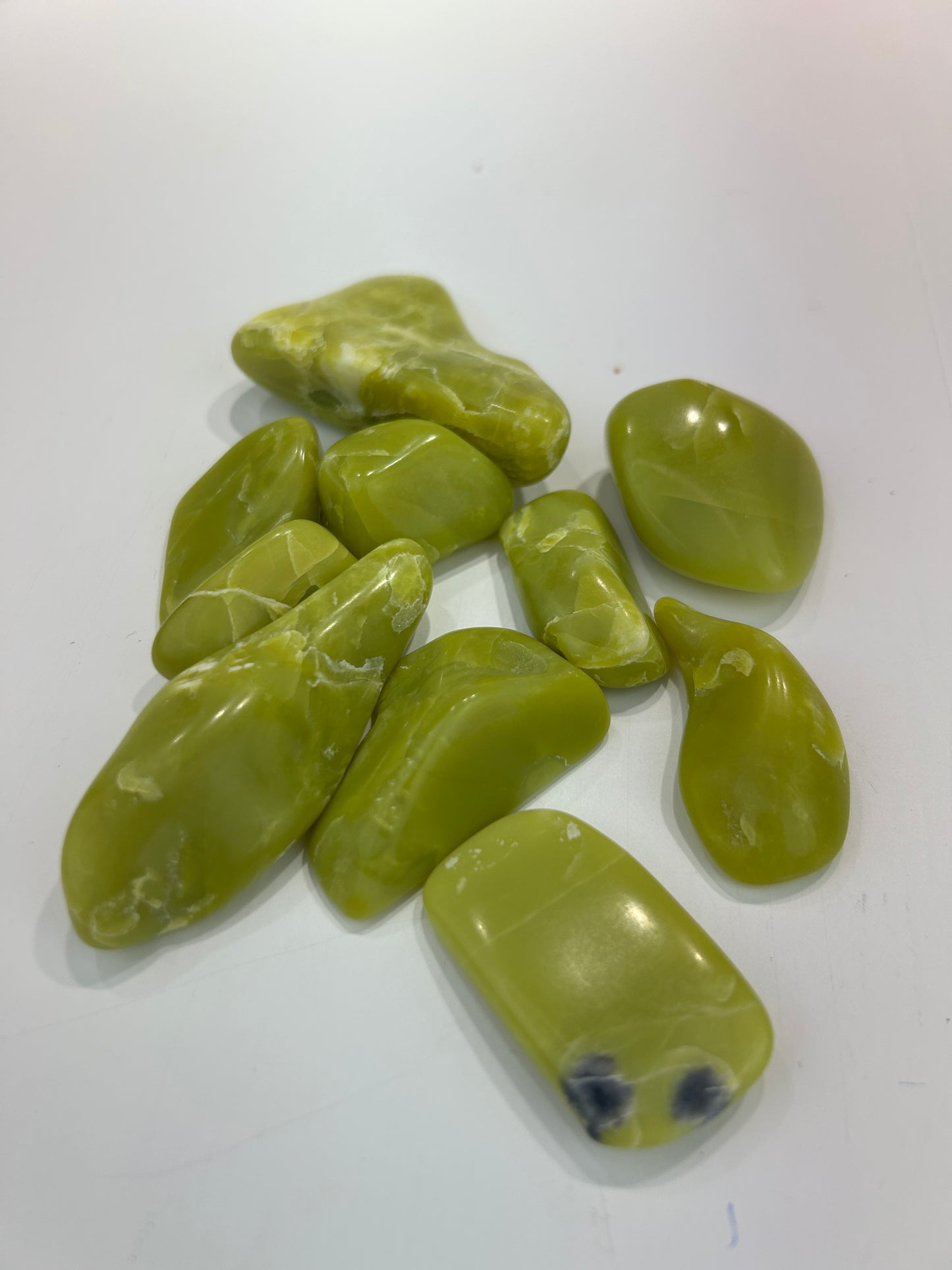 Elevate your crystal collection with the vibrant, earthy charm of our Noble Serpentine Tumbles. Each polished piece glows in a stunning olive-green hue, marked by delicate natural patterns and occasional inclusions, making every stone uniquely captivating.