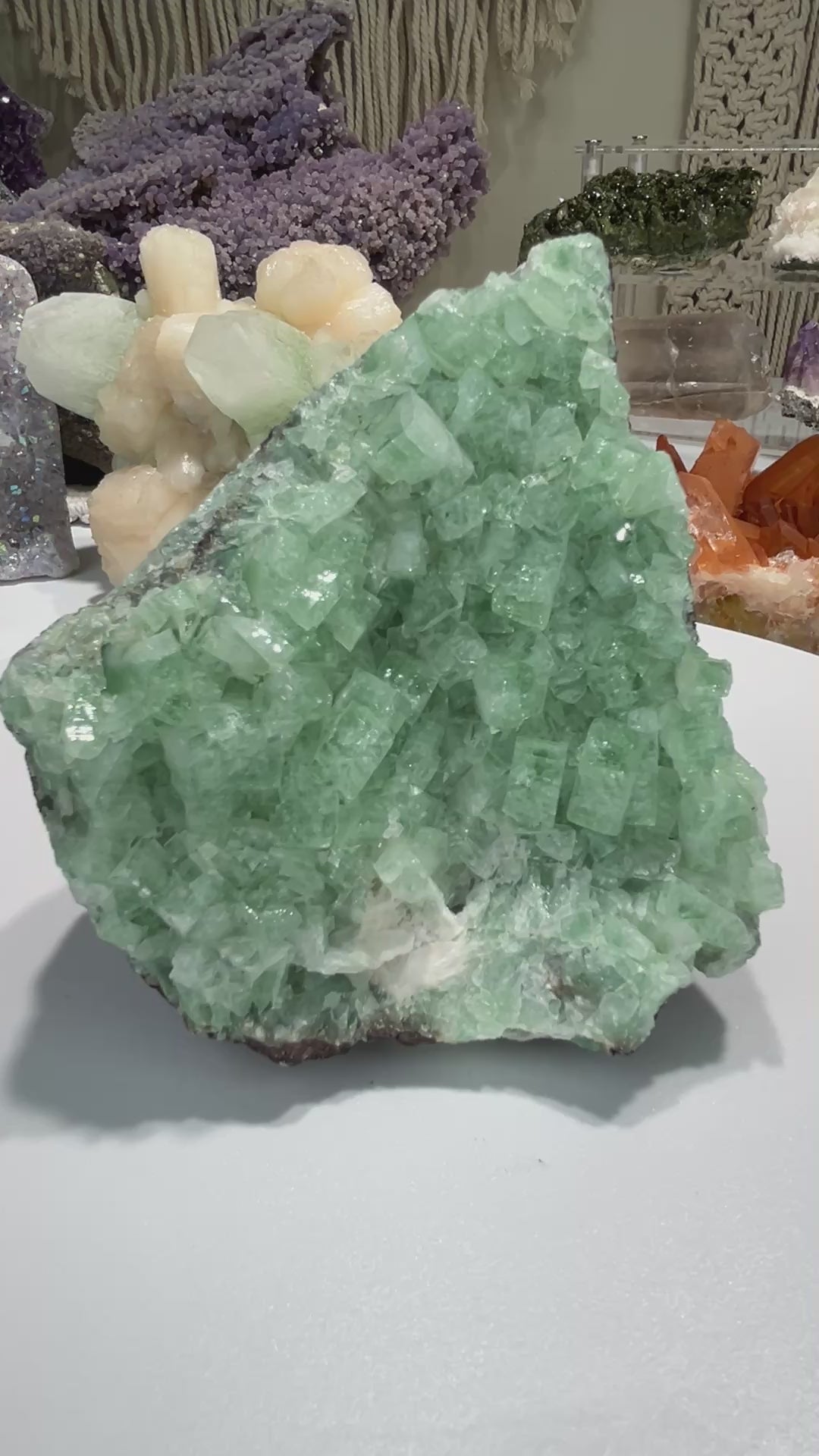 This rare Green Apophyllite specimen is a breathtaking display of natural beauty and high-vibrational energy. With its shimmering, minty-green crystals and radiant luster, this piece is both visually captivating and energetically soothing.